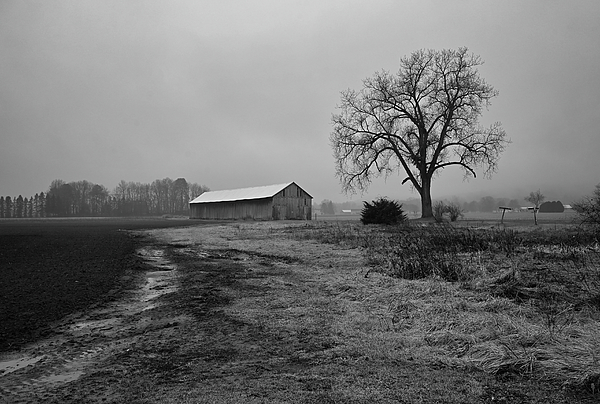 View across across a farm field, near Hadley Massachusetts, with a barn and tree on a wet, cold, foggy day in black and white