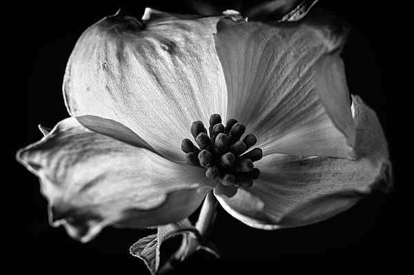 Closeup of a dogwood flower showing internal structure in black and white isolated on a dark background