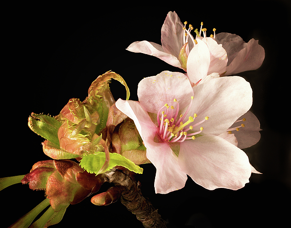 Close-up of a cherry blossom isolated on a dark background with leaves just starting to open. Taken in early spring in Massachusetts