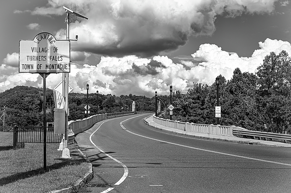 View winding across the bridge exiting Turners Falls Massachusetts in black and white with dramatic storm clouds near the Canalside Rail Trail