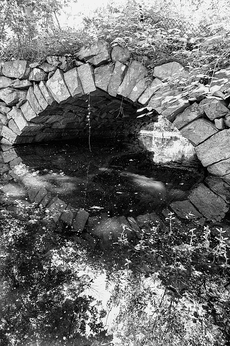 One of two arches of he historic Sands Bridge ruin in Methuen Massachusetts in black and white