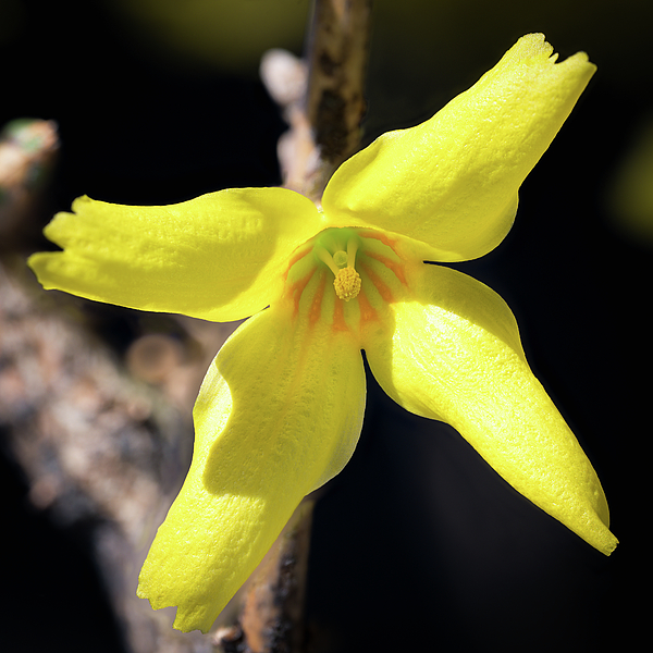 Closeup of a single forsythia bloom isolated on a dark background