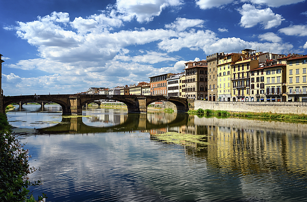 A summer view from the banks of the Arno River, in Florence Italy, with a bridge, buildings and clouds reflected in the water