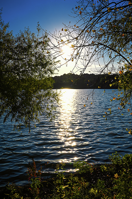 Sunset through the trees on the banks of Spy Pond in Arlington Massachusetts taken from the Minuteman Commuter Bikeway