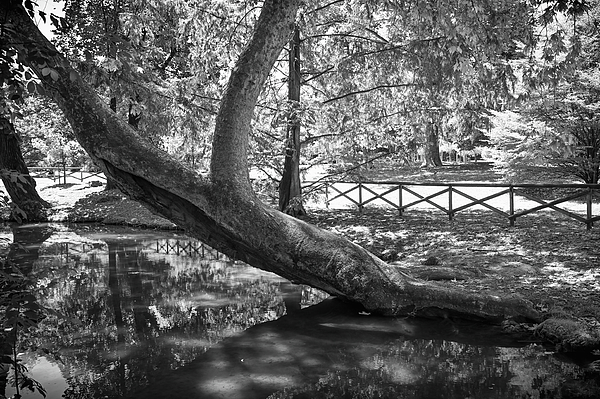 Tilted tree holding on tenaciously by the roots at the waters edge in the Sempione Park of Milan Italy in Black and White