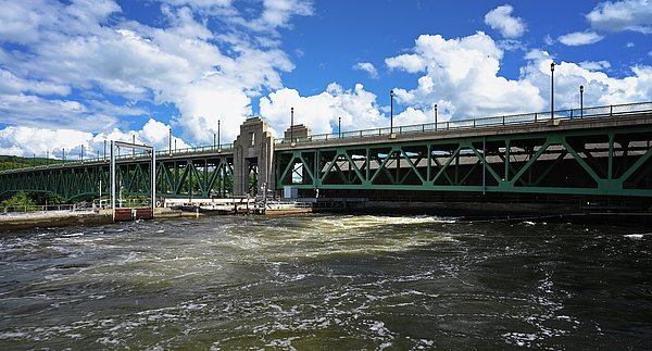 Panoramic of the Turners Falls-Gills Bridge crossing the Connecticut River in Massachusetts seen from the Canalside Rail Trail