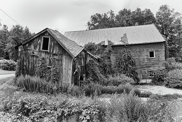 Twisted and crumbling barn in black and white slowly being overgrown somewhere near Greenfield Massachusetts